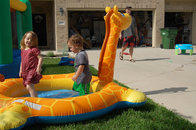 We spent many hours outside on Saturday - we set up the bounce house, the water table, and a little pool. Our front yard looked like a toddler's dream (a home owner's nightmare). Lots and lots of fun!!!